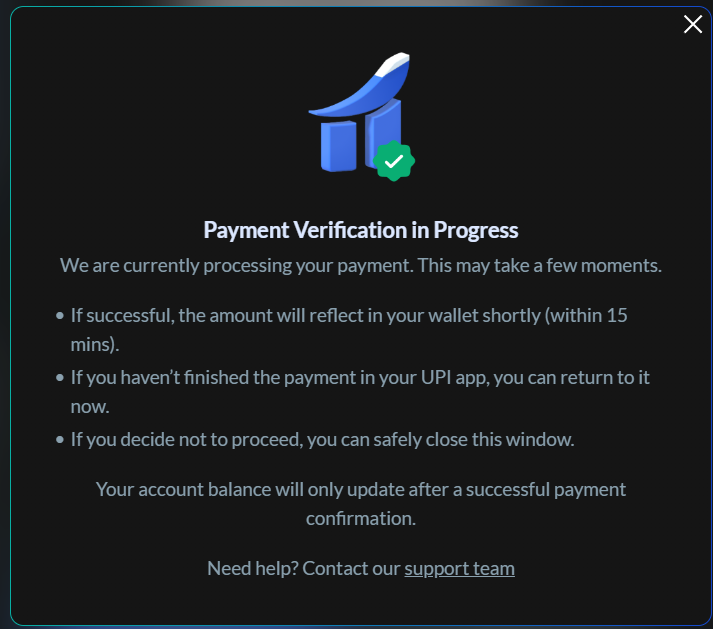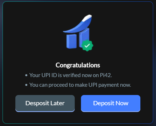 Note: UPI deposits on Pi42 are completely FREE and are typically credited within 15 minutes after a successful payment from a whitelisted UPI ID.