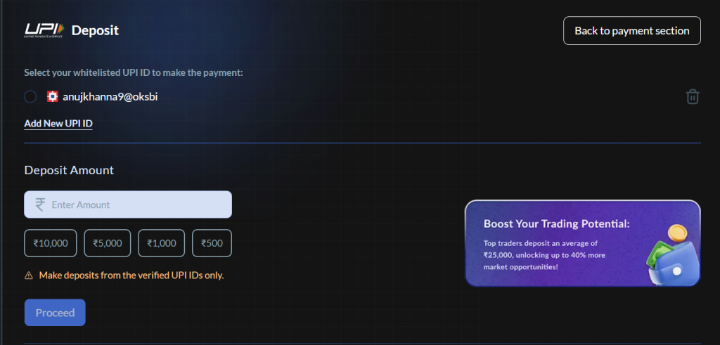 Note: UPI deposits are available only after completing KYC and bank verification.